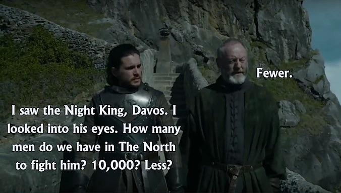 Ahora que ya hemos hablado acerca de la diferencia entre fewer y less, seguramente muchos os estaréis preguntando qué tienen que ver Jon Snow y Davos Seaworth con todo esto. Pues es tan sencillo como que probablemente los guionistas de Juego de tronos estaban tan cansados de ver este error repetido una y otra vez entre los angloparlantes que decidieron ofrecer al mundo una lección gramatical a lo grande por medio de uno de los mayores éxitos de la historia televisiva.