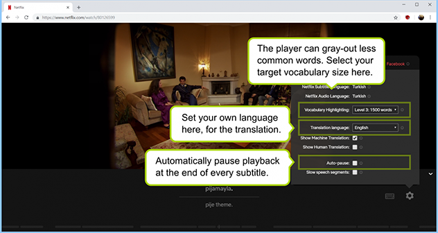 Esta herramienta, además de proporcionar subtítulos simultáneos en dos idiomas, resalta el vocabulario complejo o interesante de la serie y te permite hacer clic sobre él para acceder a la entrada de varios diccionarios para que poco a poco puedas aumentar tu léxico.